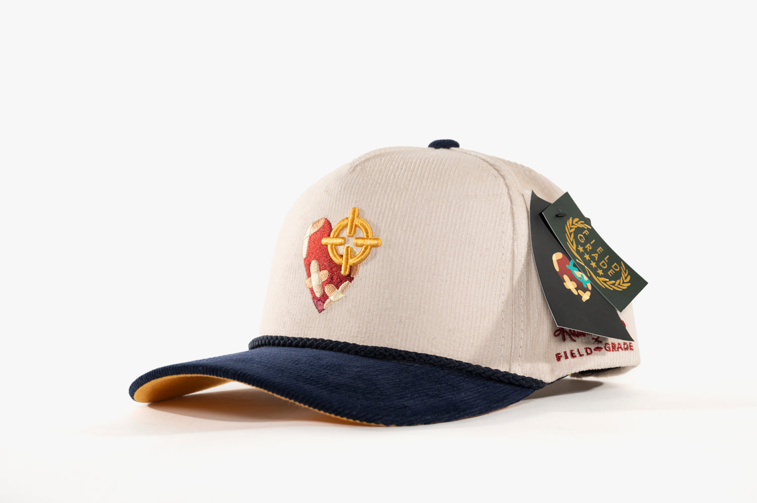 Tan/ Beige /Off-White Base, Navy Blue Brim. Sunglow Yellow Underbrim