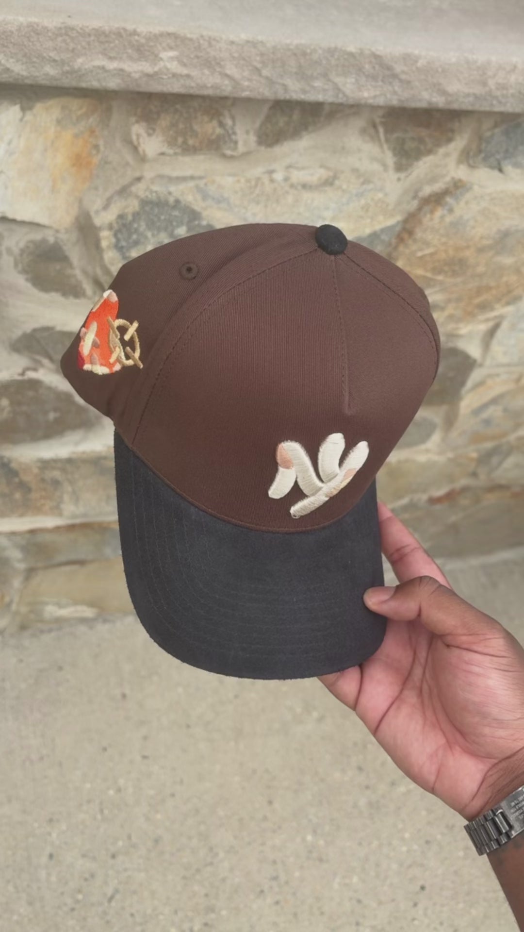 100% cotton Base Suede Black Brim , White Logos, Brown Base, Black Brim , Grey Underbrim